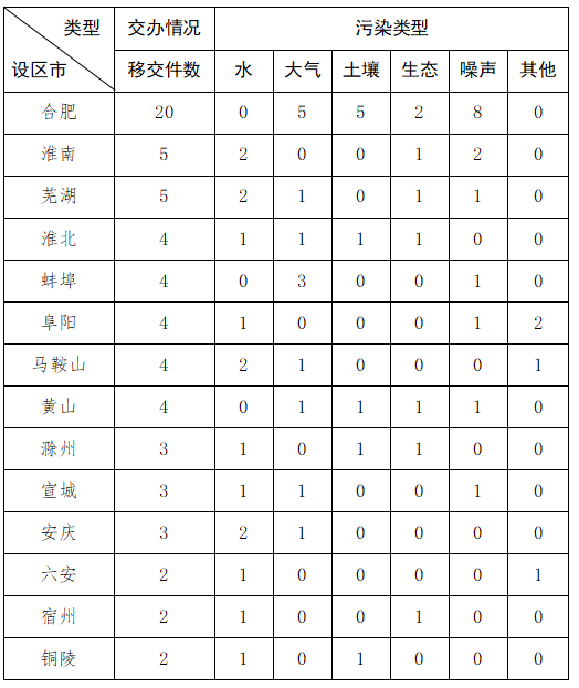 截至10月23日9时,我省收到中央第二生态环境保护督察组转办的第三批群众信访举报件65件,涉及环境问题65个。其中,水环境问题15个、噪音问题15个、大气环境问题14个、土壤问题9个、生态问题8个、其他污染问题4个。第三批转办信访件涉及14个地市,分别是:合肥市(20件)、淮南市(5件)、芜湖市(5件)、淮北市(4件)、蚌埠市(4件)、阜阳市(4件)、马鞍山市(4件)、黄山市(4件)、滁州市(3件)、宣城市(3件)、安庆市(3件)、六安市(2件)、宿州市(2件)、铜陵市(2件)。