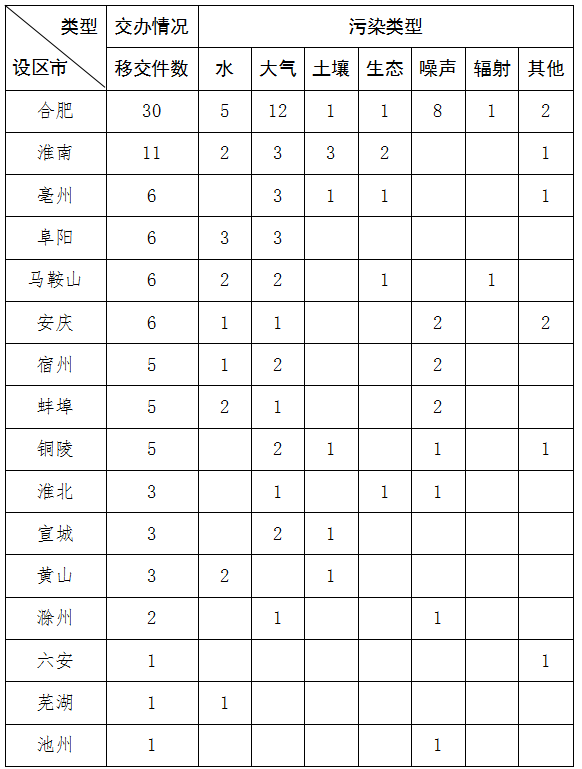 截至10月27日9时,我省收到中央第二生态环境保护督察组转办的第七批群众信访举报件94件,涉及环境问题94个。其中,大气环境问题33个、水环境问题19个、噪声问题18个、土壤问题8个、其他污染问题8个、生态问题6个、辐射问题2个。第七批转办信访件涉及16个地市,分别是:合肥市(30件)、淮南市(11件)、亳州市(6件)、阜阳市(6件)、马鞍山市(6件)、安庆市(6件)、宿州市(5件)、蚌埠市(5件)、铜陵市(5件)、淮北市(3件)、宣城市(3件)、黄山市(3件)、滁州市(2件)、六安市(1件)、芜湖市(1件)、十大博彩平台(1件)。