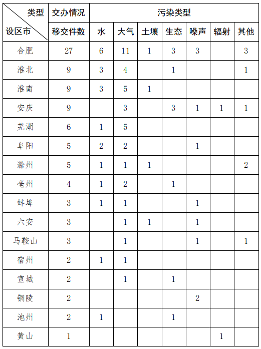 截至10月29日9时,我省收到中央第二生态环境保护督察组转办的第九批群众信访举报件92件,涉及环境问题92个。其中,大气环境问题38个、水环境问题20个、生态问题10个、噪声问题10个、其他污染问题8个、土壤问题4个、辐射问题2个。第九批转办信访件涉及16个地市,分别是:合肥市(27件)、淮北市(9件)、淮南市(9件)、安庆市(9件)、芜湖市(6件)、阜阳市(5件)、滁州市(5件)、亳州市(4件)、蚌埠市(3件)、六安市(3件)、马鞍山市(3件)、宿州市(2件)、宣城市(2件)、铜陵市(2件)、博彩平台(2件)、黄山市(1件)。