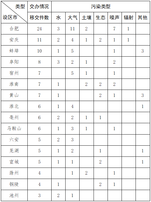 截至10月30日9时,我省收到中央第二生态环境保护督察组转办的第十批群众信访举报件118件,涉及环境问题118个。其中,大气环境问题44个、水环境问题22个、噪声问题18个、生态问题12个、土壤问题11个、其他污染问题9个、辐射问题2个。第十批转办信访件涉及16个地市,分别是:合肥市(24件)、安庆市(11件)、蚌埠市(10件)、阜阳市(8件)、宿州市(7件)、淮南市(7件)、黄山市(7件)、淮北市(6件)、亳州市(6件)、马鞍山市(6件)、六安市(5件)、芜湖市(5件)、宣城市(5件)、滁州市(4件)、铜陵市(4件)、博彩平台(3件)。