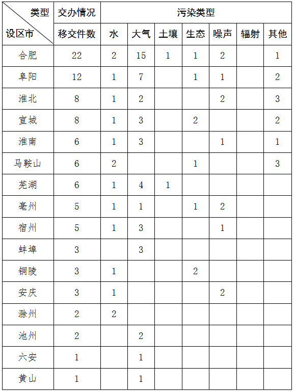 截至11月2日9时,我省收到中央第二生态环境保护督察组转办的第十三批群众信访举报件93件,涉及环境问题93个。其中,大气环境问题45个、水环境问题15个、其他污染问题12个、噪声问题11个、生态问题8个、土壤问题2个。第十三批转办信访件涉及16个地市,分别是:合肥市(22件)、阜阳市(12件)、淮北市(8件)、宣城市(8件)、淮南市(6件)、马鞍山市(6件)、芜湖市(6件)、亳州市(5件)、宿州市(5件)、蚌埠市(3件)、铜陵市(3件)、安庆市(3件)、滁州市(2件)、博彩平台(2件)、六安市(1件)、黄山市(1件)。