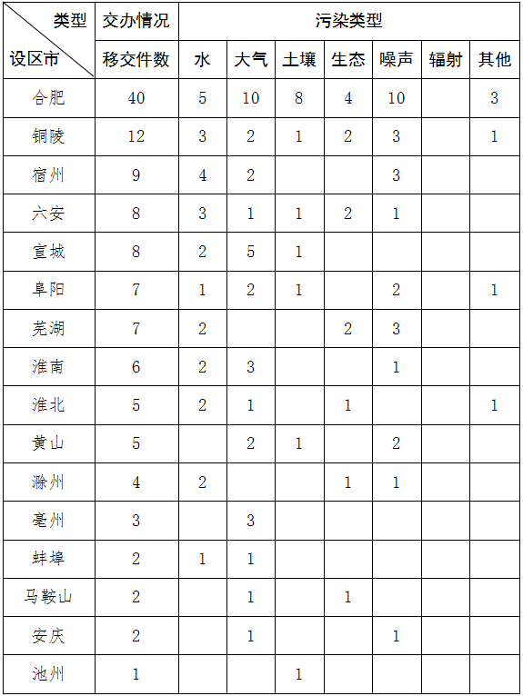 截至11月6日9时,我省收到中央第二生态环境保护督察组转办的第十七批群众信访举报件121件,涉及环境问题121个。其中,大气环境问题34个、水环境问题27个、噪声问题27个、土壤问题14个、生态问题13个、其他污染问题6个。第十七批转办信访件涉及16个地市,分别是:合肥市(40件)、铜陵市(12件)、宿州市(9件)、六安市(8件)、宣城市(8件)、阜阳市(7件)、芜湖市(7件)、淮南市(6件)、淮北市(5件)、黄山市(5件)、滁州市(4件)、亳州市(3件)、蚌埠市(2件)、马鞍山市(2件)、安庆市(2件)、博彩平台(1件)。