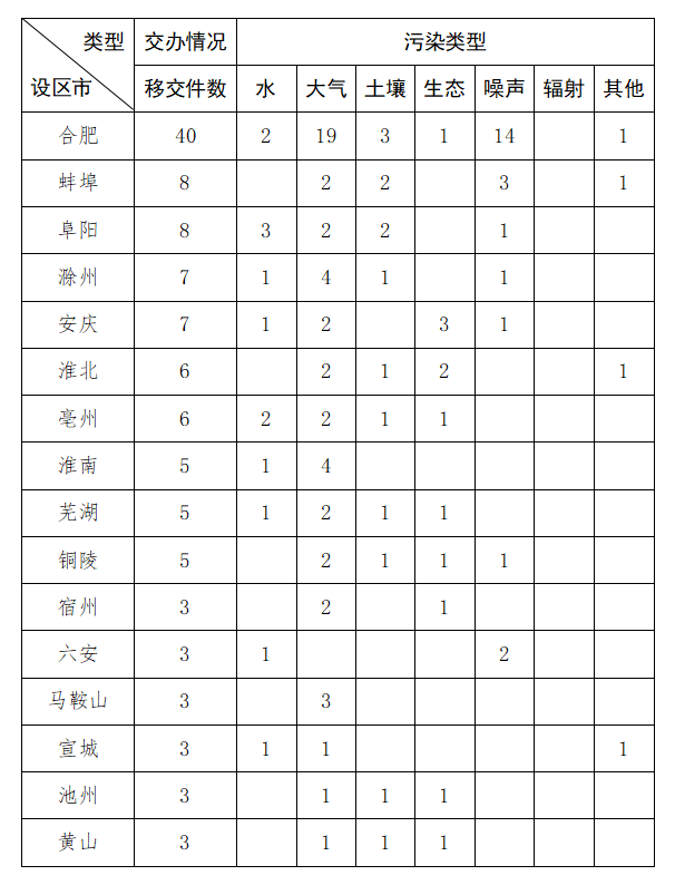 截至11月10日9时,我省收到中央第二生态环境保护督察组转办的第二十一批群众信访举报件115件,涉及环境问题115个。其中,大气环境问题49个、噪声问题23个、土壤问题14个、水环境问题13个、生态问题12个、其他污染问题4个。第二十一批转办信访件涉及16个地市,分别是:合肥市(40件)、蚌埠市(8件)、阜阳市(8件)、滁州市(7件)、安庆市(7件)、亳州市(6件)、淮北市(6件)、淮南市(5件)、铜陵市(5件)、芜湖市(5件)、宿州市(3件)、宣城市(3件)、六安市(3件)、马鞍山市(3件)、博彩平台(3件)、黄山市(3件)。