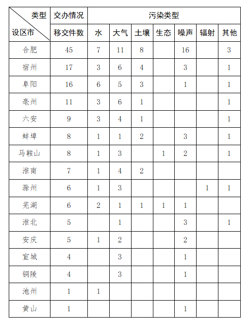 截至11月15日9时,我省收到中央第二生态环境保护督察组转办的第二十六批群众信访举报件153件,涉及环境问题153个。其中,大气环境问题53个、噪声问题34个、水环境问题30个、土壤问题22个、其他污染问题11个、生态问题2个、辐射问题1个。第二十六批转办信访件涉及16个地市,分别是:合肥市(45件)、宿州市(17件)、阜阳市(16件)、亳州市(11件)、六安市(9件)、蚌埠市(8件)、马鞍山市(8件)、淮南市(7件)、滁州市(6件)、芜湖市(6件)、安庆市(5件)、淮北市(5件)、宣城市(4件)、铜陵市(4件)、博彩平台(1件)、黄山市(1件)。