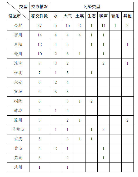 截至11月17日9时,我省收到中央第二生态环境保护督察组转办的第二十八批群众信访举报件134件,涉及环境问题134个。其中,大气环境问题61个、水环境问题28个、噪声问题20个、土壤问题10个、生态问题8个、其他污染问题6个、辐射问题1个。第二十八批转办信访件涉及16个地市,分别是:合肥市(37件)、宿州市(14件)、阜阳市(12件)、亳州市(10件)、淮南市(8件)、淮北市(7件)、六安市(6件)、宣城市(6件)、铜陵市(6件)、蚌埠市(5件)、滁州市(5件)、马鞍山市(5件)、安庆市(5件)、黄山市(4件)、芜湖市(3件)、博彩平台(1件)。