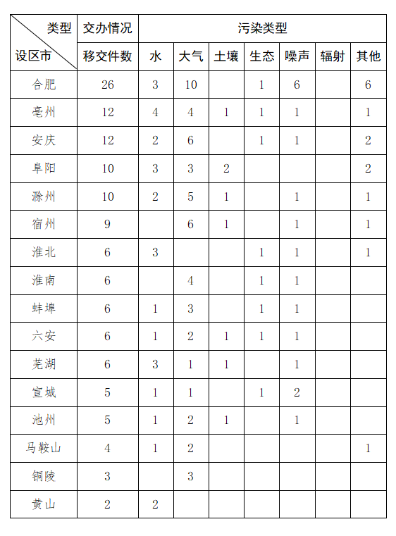 截至11月18日9时,我省收到中央第二生态环境保护督察组转办的第二十九批群众信访举报件128件,涉及环境问题128个。其中,大气环境问题52个、水环境问题27个、噪声问题18个、其他污染问题15个、土壤问题8个、生态问题8个。第二十九批转办信访件涉及16个地市,分别是:合肥市(26件)、亳州市(12件)、安庆市(12件)、阜阳市(10件)、滁州市(10件)、宿州市(9件)、淮北市(6件)、淮南市(6件)、蚌埠市(6件)、六安市(6件)、芜湖市(6件)、宣城市(5件)、十大博彩平台(5件)、马鞍山市(4件)、铜陵市(3件)、黄山市(2件)。
