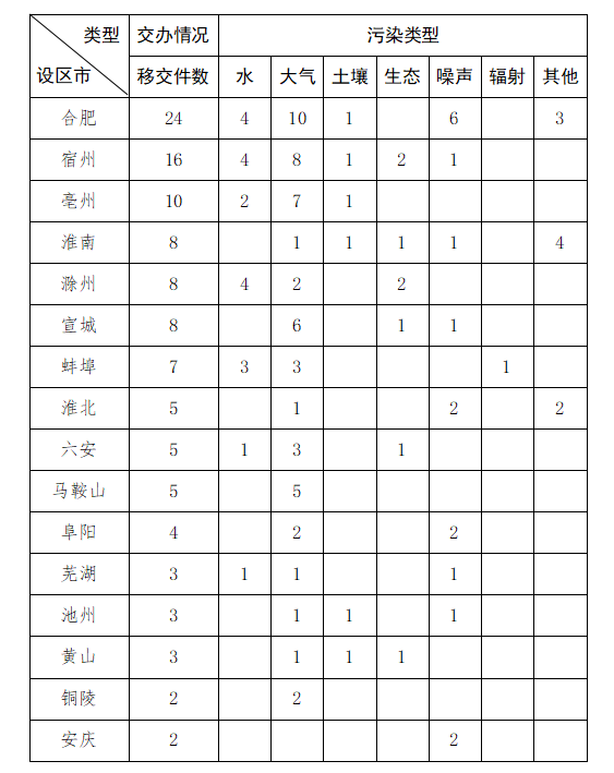 截至11月19日9时,我省收到中央第二生态环境保护督察组转办的第三十批群众信访举报件113件,涉及环境问题113个。其中,大气环境问题53个、水环境问题19个、噪声问题17个、其他污染问题9个、土壤问题6个、生态问题8个、辐射问题1个。第三十批转办信访件涉及16个地市,分别是:合肥市(24件)、宿州市(16件)、亳州市(10件)、淮南市(8件)、滁州市(8件)、宣城市(8件)、蚌埠市(7件)、淮北市(5件)、六安市(5件)、马鞍山市(5件)、阜阳市(4件)、芜湖市(3件)、博彩平台(3件)、黄山市(3件)、铜陵市(2件)、安庆市(2件)。