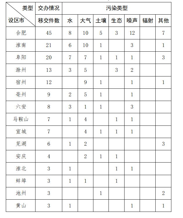 截至11月21日9时,我省收到中央第二生态环境保护督察组转办的第三十二批群众信访举报件164件,涉及环境问题164个。其中,大气环境问题60个、水环境问题34个、噪声问题27个、其他污染问题18个、土壤问题13个、生态问题12个。第三十二批转办信访件涉及15个地市,分别是:合肥市(45件)、淮南市(21件)、阜阳市(20件)、滁州市(13件)、宿州市(12件)、亳州市(9件)、六安市(8件)、马鞍山市(7件)、宣城市(7件)、芜湖市(6件)、安庆市(4件)、淮北市(3件)、蚌埠市(3件)、十大博彩平台(3件)、黄山市(3件)。