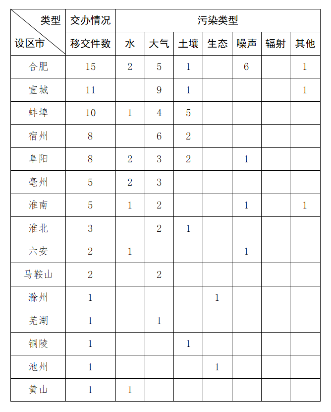 11月26日9时,我省收到中央第二生态环境保护督察组转办的第三十三批群众信访举报件74件,涉及环境问题74个。其中,大气环境问题37个、土壤问题13个、水环境问题10个、噪声问题9个、其他污染问题3个、生态问题2个。第三十三批转办信访件涉及15个地市,分别是:合肥市(15件)、宣城市(11件)、蚌埠市(10件)、宿州市(8件)、阜阳市(8件)、亳州市(5件)、淮南市(5件)、淮北市(3件)、六安市(2件)、马鞍山市(2件)、滁州市(1件)、芜湖市(1件)、铜陵市(1件)、博彩平台(1件)、黄山市(1件)。