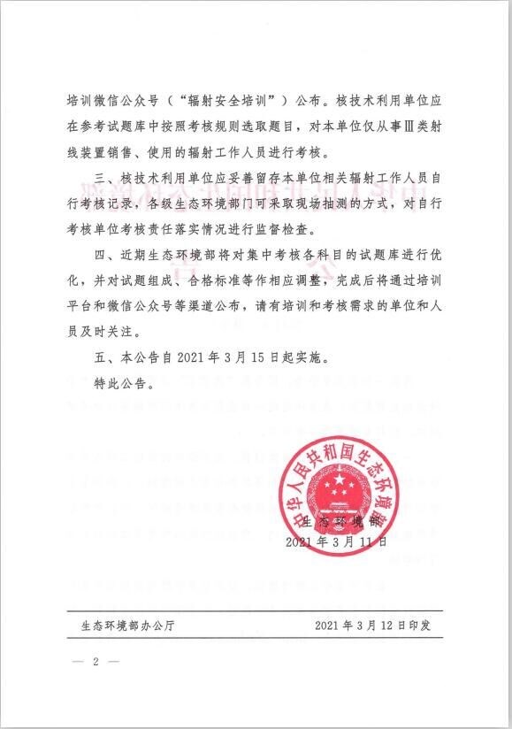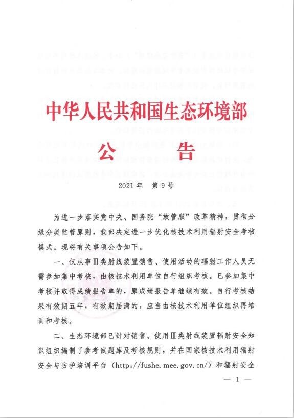 为进一步落实党中央、国务院“放管服”改革精神,贯彻分级分类监管原则,进一步优化核技术利用辐射安全考核模式,生态环境部发布《关于进一步优化辐射安全考核的公告》,对从事Ⅲ类射线装置销售、使用活动的辐射工作人员不再要求参加集中考核,由核技术利用单位自行组织考核。公告如下: